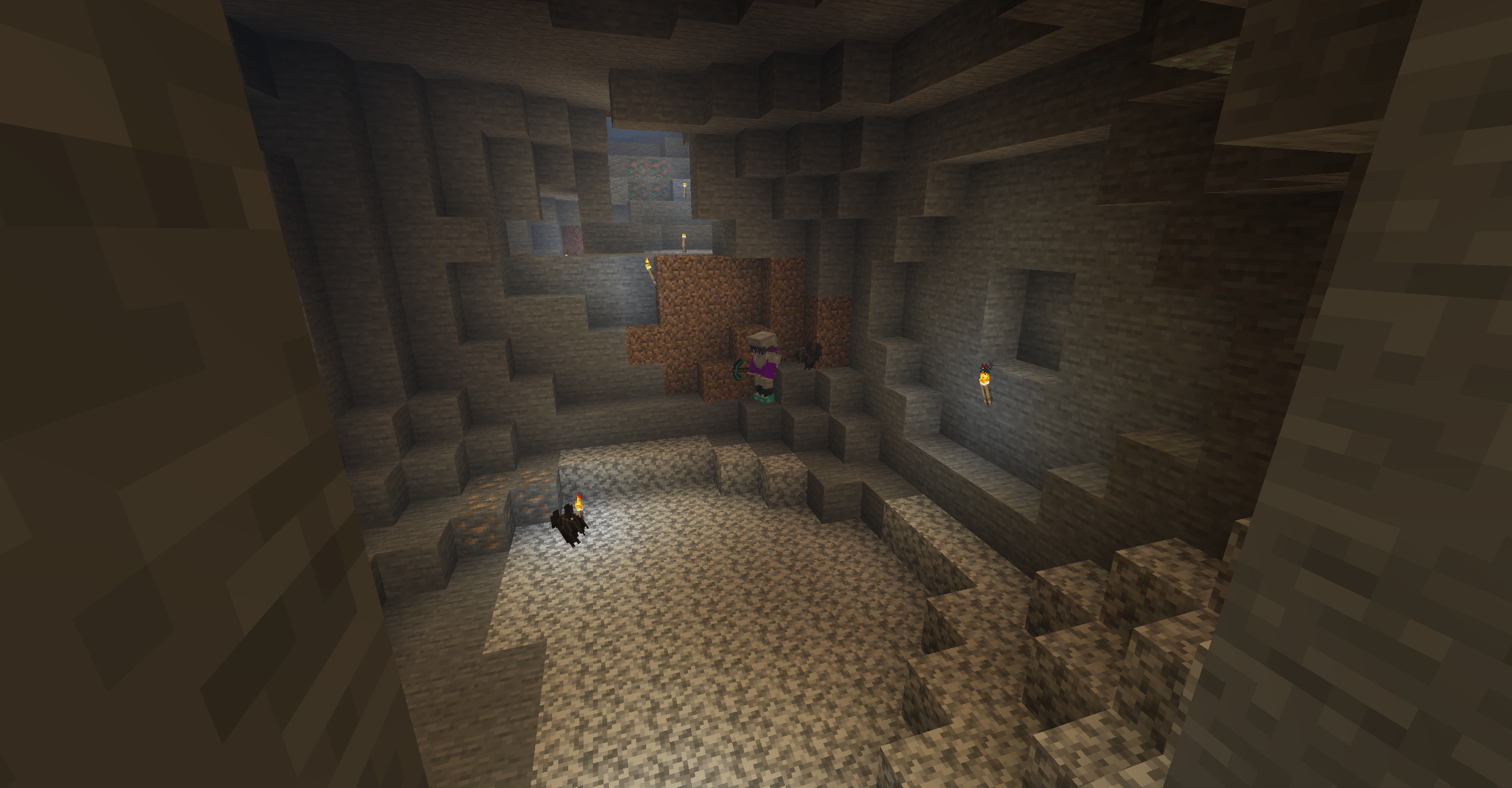空の明かりはないため、敵がたくさん沸いている。鉱石が露出していたり、溶岩溜まりや巨大な穴ができていることもある。